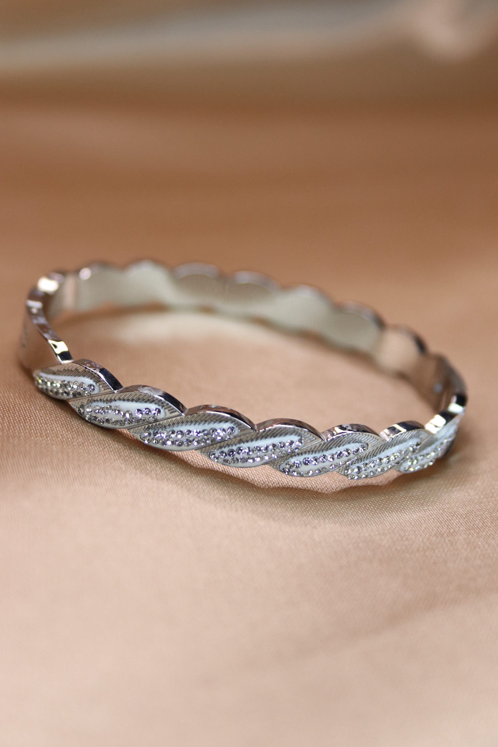 Questo elegante bracciale in acciaio inossidabile, con un raffinato design intrecciato, è il complemento perfetto per chi cerca uno stile sofisticato e moderno. Il motivo ondulato, arricchito da una fila di piccoli cristalli incastonati, aggiunge un tocco di brillantezza che cattura la luce in modo discreto ma affascinante. La combinazione di lucentezza metallica e dettagli scintillanti lo rende ideale sia per un look quotidiano raffinato che per occasioni speciali. Con la sua robustezza e resistenza all'usura, questo bracciale è pensato per durare nel tempo, mantenendo intatta la sua bellezza. Perfetto per chi vuole esprimere eleganza senza tempo con un accessorio che parla di stile e personalità.